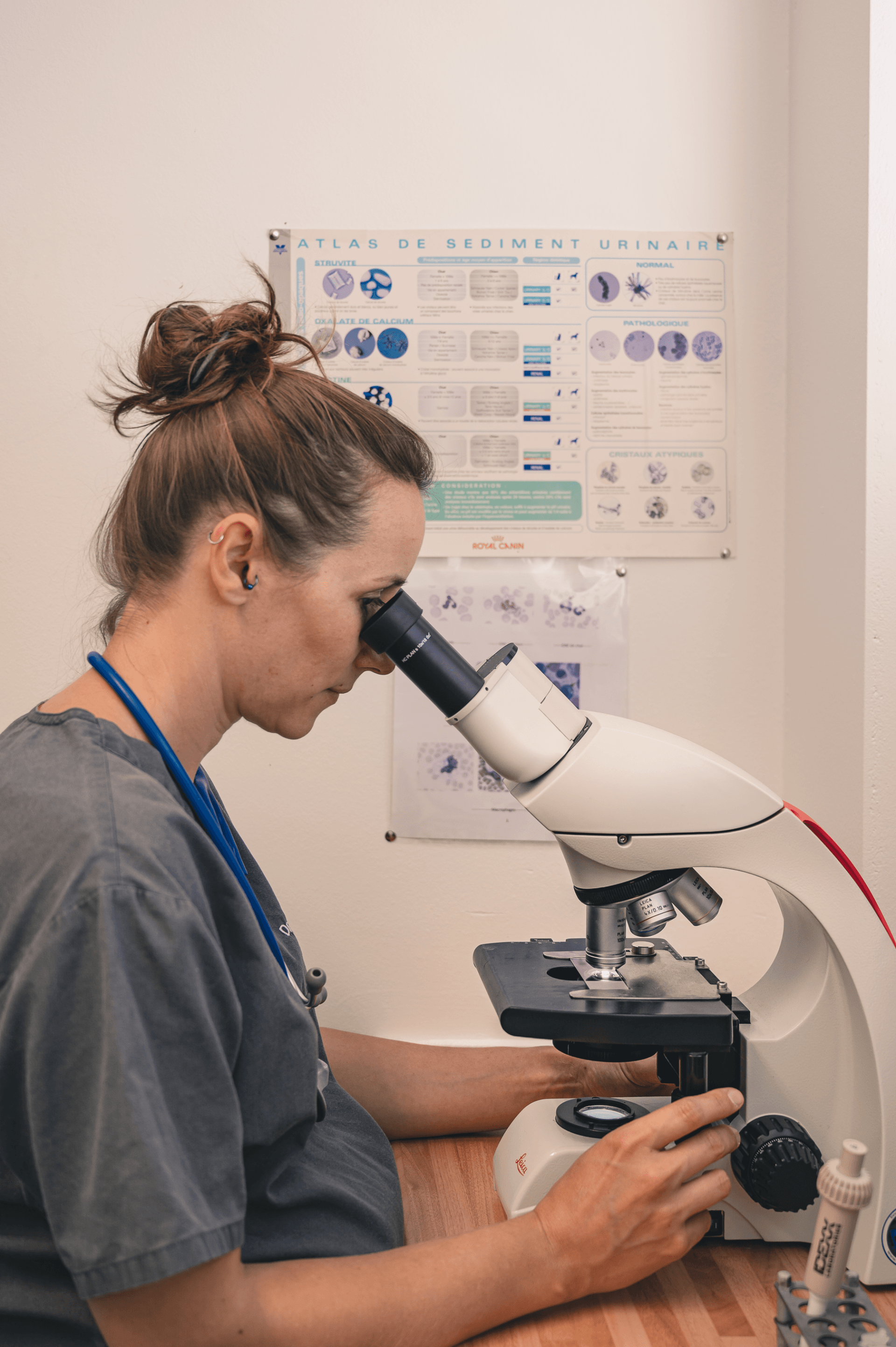 Lorsqu'une analyse d'urine a besoin d'être réalisée, nous procédons à une cystocentèse: il s'agit d'un prélèvement d'urine directement dans la vessie, avec une aiguille fine et une seringue, sous contrôle échographique. Cet examen est indolore et apporte souvent de nombreuses informations.
